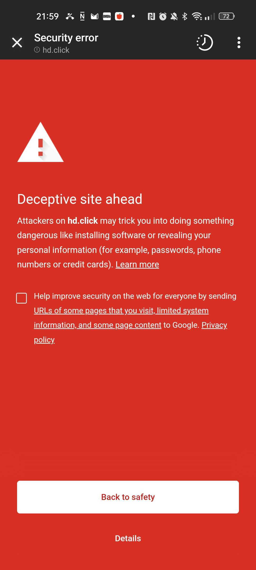 From time to time our friends at Google may flag a website as potentially unsafe or user beware. It’s a big red screen, and you must click “Details” and then “Visit a this unsafe site” to enter.If you have experienced this on one of our pages such as hd.click/ user, you can use hdclick.app/ user as an alternate link. Feel free to contact support for any other concerns.